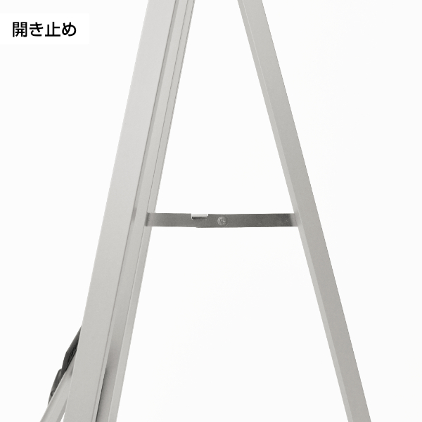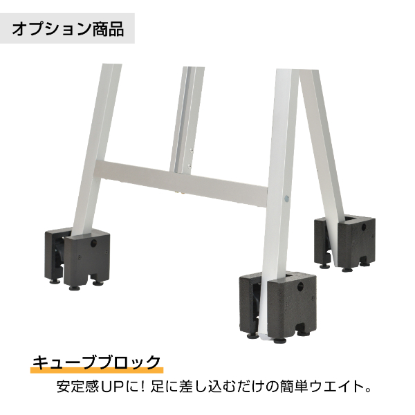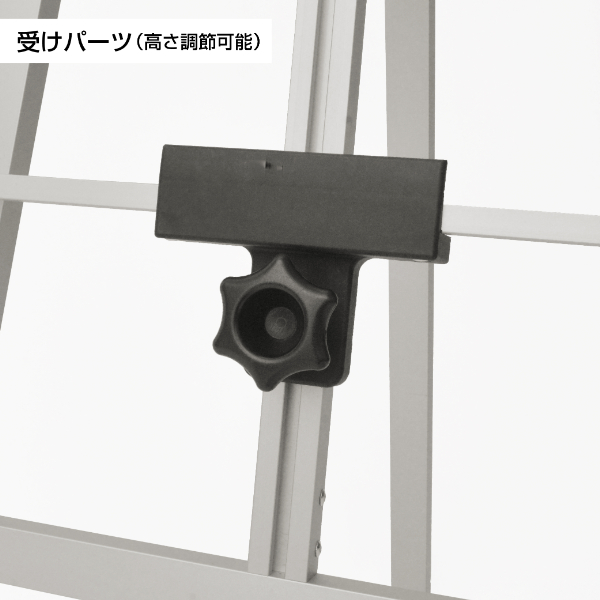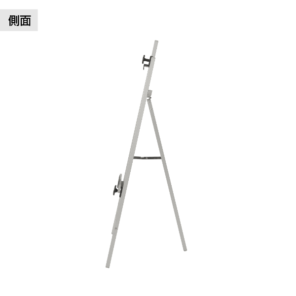 軽くて丈夫な定番型アルミイーゼル。シンプルなデザインでどんなポスターフレームともなじみます。 設置したいパネルに合わせて、押さえパーツ・受けパーツの位置を調整し、上下から挟み込んでしっかりと固定できます。A1タテなどの高さ900mmまで・厚さ30mmまでのパネルを置くことができ、看板やウェルカムボードのスタンドとして活躍します。屋外に置く場合は、安定感をアップさせる別売りのキューブブロックを使うのがおすすめ。厚さ15mmまでの薄めのパネルには別途付属のパーツも使用できます。折りたたみ可能で収納時も省スペース。大型でも組み立て不要ですぐに使えます。
