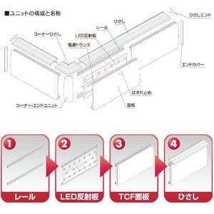 | 素材 | レール:アルミ押出形材(アルマイト仕上げ)、カラー:シルバー、ひさし:アルミ押出形材(アルマイト仕上げ)、カラー:シルバー、面板/表:アクリル樹脂 乳白色、裏:アクリル樹脂 透明 |