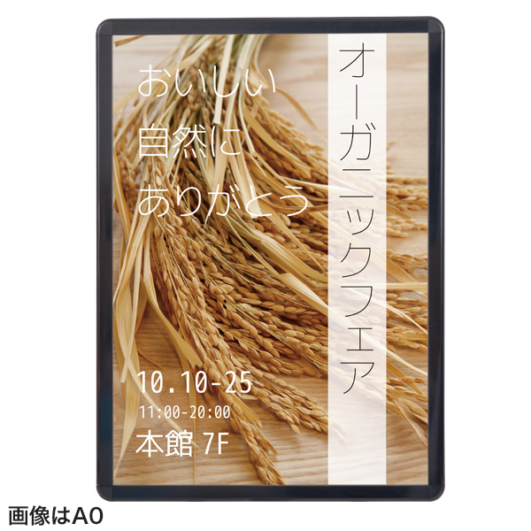板バネ内蔵によりパネル面をしっかり押さえます。4辺のフレーム開きなのでポスターの入替えがラクラク。