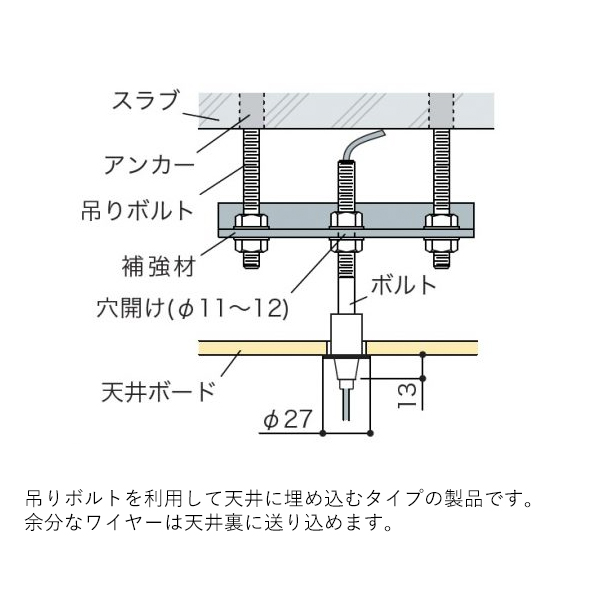 | 備考 | ○ワイヤーグリップタイプ○一方向固定○吊りボルトを利用して天井に埋め込むタイプです○余分なワイヤーは天井裏に送り込めます |