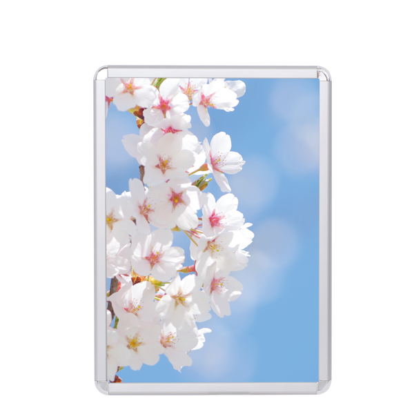 板バネ内蔵によりパネル面をしっかり押さえます。4辺のフレーム開きなのでポスターの入替えがラクラク。