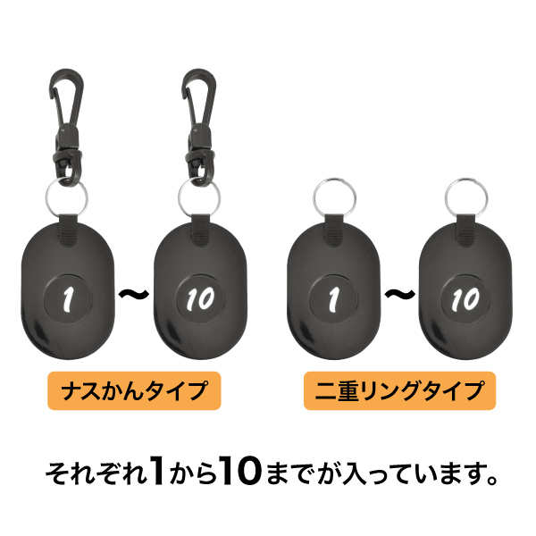 ナスかんタイプと二重リングタイプがペアになった、シンプルで便利な番号札。1〜10までのセットで、収納に便利な専用ケース付き。二重リングタイプには鍵やキーホルダーを取り付けられます。ナスかんタイプは引っ掛けて使うことができるので、細めの持ち手や取っ手、リュックや衣服のベルトループなどに簡単に取り付けられます。金具のない番号札は失くしそうで不安…という方にもおすすめの、紛失防止にも役立つ番号札です。預かり札や引換券としてはもちろん、飲食店や施設では呼び出し用の整理番号札として、ライブハウスやイベント会場でのクロークチケットとして、様々な場面でマルチに活躍します。