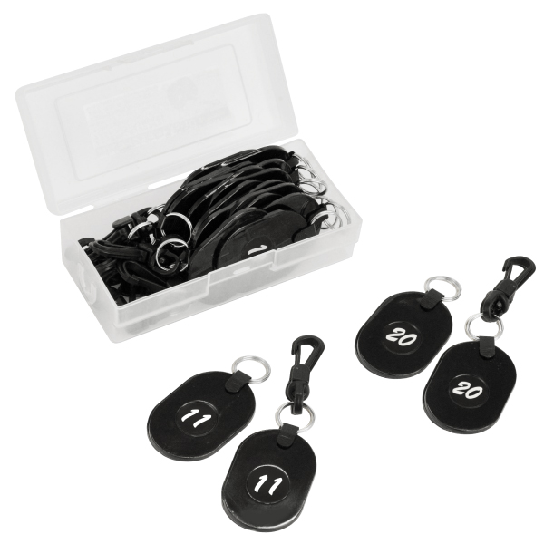 ナスかんタイプと二重リングタイプがペアになった、シンプルで便利な番号札。11〜20までのセットで、収納に便利な専用ケース付き。二重リングタイプには鍵やキーホルダーを取り付けられます。ナスかんタイプは引っ掛けて使うことができるので、細めの持ち手や取っ手、リュックや衣服のベルトループなどに簡単に取り付けられます。金具のない番号札は失くしそうで不安…という方にもおすすめの、紛失防止にも役立つ番号札です。預かり札や引換券としてはもちろん、飲食店や施設では呼び出し用の整理番号札として、ライブハウスやイベント会場でのクロークチケットとして、様々な場面でマルチに活躍します。