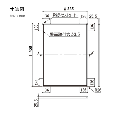 | 素材 | フレーム:アルミ押出材・ツヤ無しアルマイト仕上、コーナー:亜鉛ダイカスト・塗装仕上、面板:透明アクリル1.5mm・MDFボード3mm |