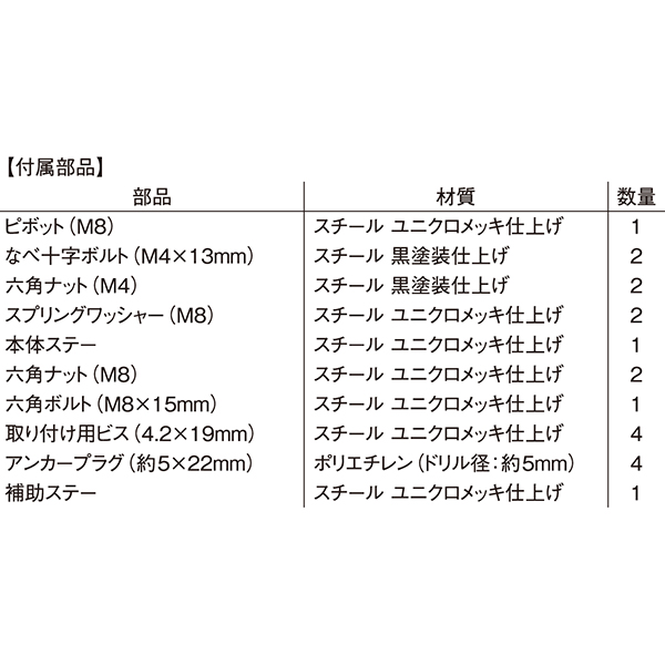 | 付属品 | 平面用取付金具(ビス・アンカー) |