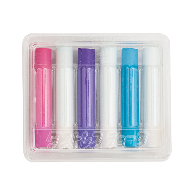 ダストレスチョークの蛍光色は、すべてホルムアルデヒドゼロ使用になりました ソフトでチョークの粉粒が重たいため空気中への飛散が少ないです。学校や塾先生だけでなく、飲食店内のメニュー書きも安心して行えます。