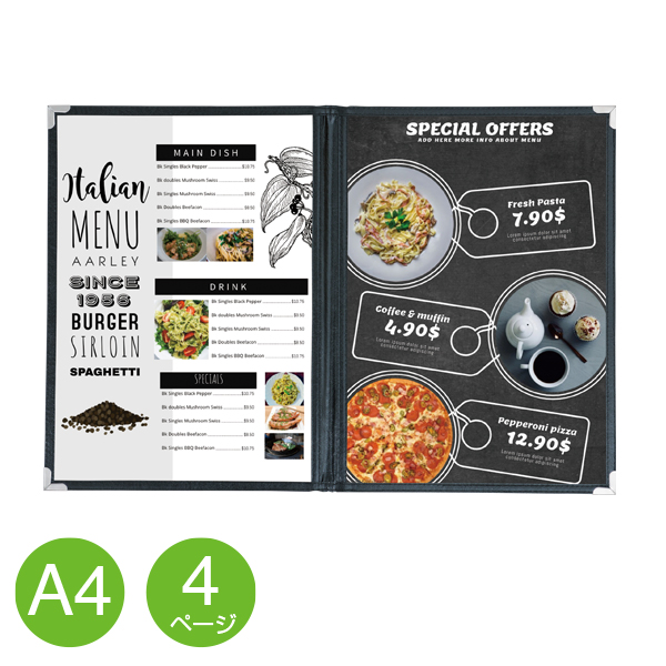 ローコストで大好評のクイックメニュー。カフェ・レストランなど様々な場所でお使いいただいております。中紙の出し入れが簡単なクリアタイプです2P〜12ページまで豊富展開。おしゃれなコーナー金具付