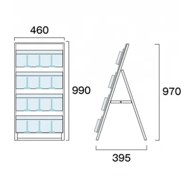 レール付アクリル面板でパンフレット交換の時短を実現。仕切り板をスライドさせて様々なパンフレットのサイズに対応可能です。