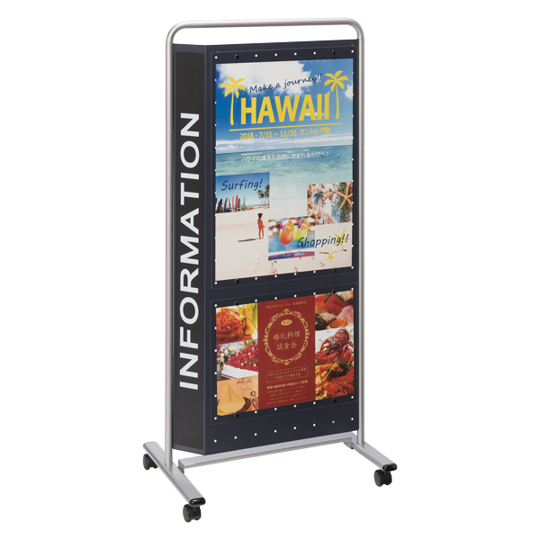正面から見ても側面から見ても表示アピールができるインフォメーションスタンド。 側面の表示パネルは左右どちらでも取付可能
