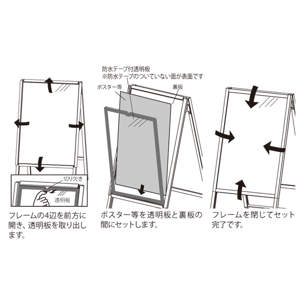 | その他仕様 | ◯両面◯屋外◯四方開閉式◯簡易防水仕様◯折りたたみ式◯保持パイプ付き |