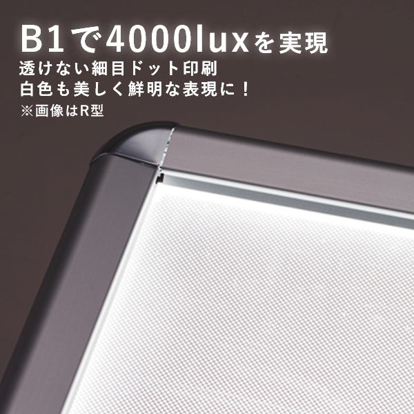 | 素材 | フレーム:アルミ押出型材、コーナー:ABS樹脂成形品、コーナー金具・開閉用バネ:ステンレス、ポスター保護:表面カバー 透明アクリル1.5mm厚、背板:アルミ複合板1mm厚、導光板:アクリル4mm厚ドット印刷方式 |