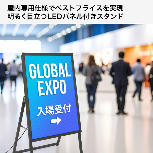 屋内専用使仕様でベストプライスを実現。明るく目立つLEDパネル付きスタンド。 抜群の存在感が入店のきっかけを作る、LED仕様のA型看板です。ポスターをパッと明るく色鮮やかに表示させ、自然に視線を集めます。 四方開閉式フレームでポスター交換も簡単。折りたためるのでコンパクトに片付けられます。 本体背面にはアダプターを収納できる専用ポケット付き。付属のフックを使えばアダプターのコードを吊り下げられ、線が絡むのを防ぎ見た目もスッキリとさせてくれます。 ショッピングモールやレストラン街・デパ地下では、他店と差をつける販促アイテムとして、屋内イベントや館内施設ではキャンペーンや会場案内の誘導表示としても活躍します。また明るく華やかな高級感を演出できるので、百貨店やアパレルショップにもおすすめです。 ひときわ目を引くLED看板で、設置したその日から集客アップを目指せます。