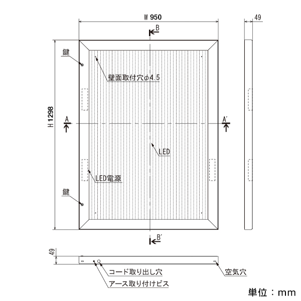 | 素材 | フレーム:アルミ押出材ツヤ無しアルマイト仕上、面板:3mm透明アクリル/5mm乳半アクリル |