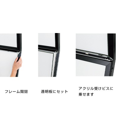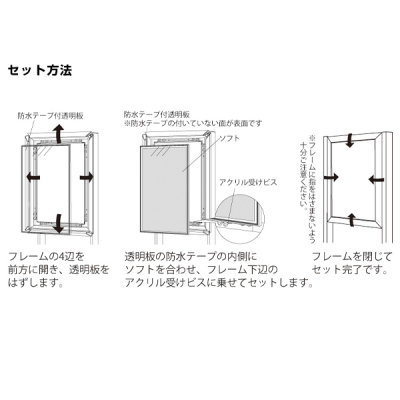 ●転倒や移動による事故防止のため、屋外でご使用の際は動かないように重りを乗せる等の対策を行ってください。●太陽の熱でアクリルが少し膨張する場合があります。●結露が発生する場合があります。ポスターは耐水性のものをご使用ください。