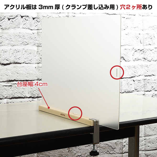 ※机の天板の形状によっては専用クランプで固定できない場合がございますので、ご確認の上ご使用ください。アクリル板と台座だけではご使用になれません。
