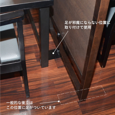 椅子を引いたときに、椅子の足が衝立の足に引っかかるお悩みを解消するため、衝立の足の位置を変えられる設計になった気遣いの衝立です