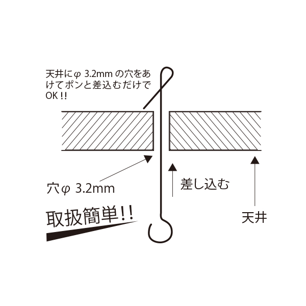 天井に取り付けたネジフックやラクチンフック等に一方のヒートン部を引っ掛け、もう一方のヒートン部にポスターなどのメディアを取り付けたポップハンガーを吊るします。