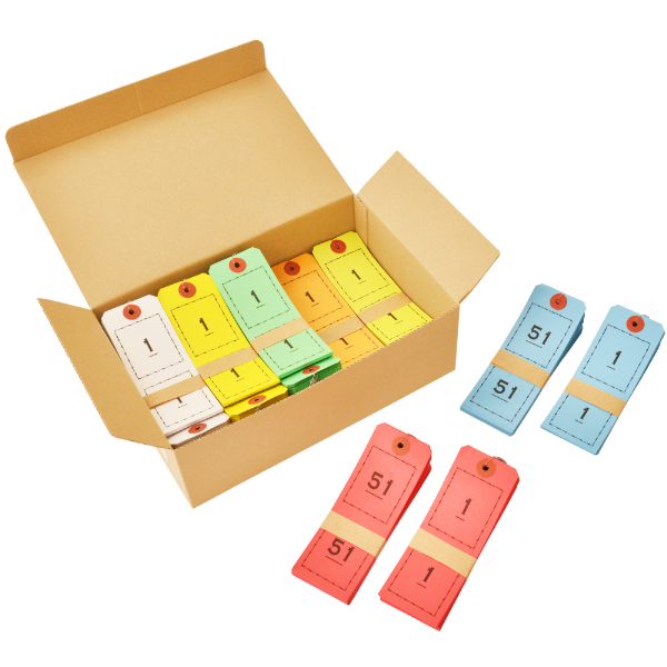「ニューペーパークロークチケット」は上下番号に簡単に切り離せる紙製のクロークチケットです。イベント会場や物品の分類・品種管理に最適です。針金付きなのでしっかりと預かり品に取り付けることができます。 ホテルクロークやイベント会場などでの預かり物の整理に。ミシン目が入っており、簡単に切り離せます。1番〜100番×10色となっていますので規模の大きいイベントでも安心