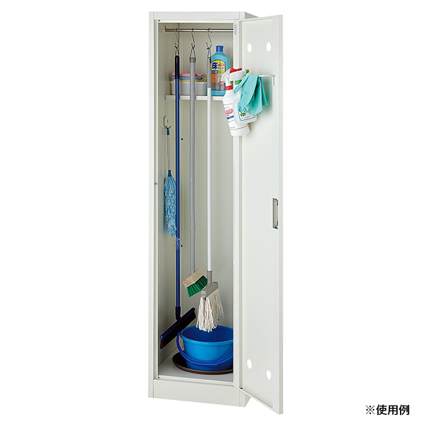 組立式のローコストタイプ掃除用具入れ。スチール製で頑丈なので、掃除道具一式を収納できます。学校、病院、オフィスなどで使える定番掃除用具入れです。