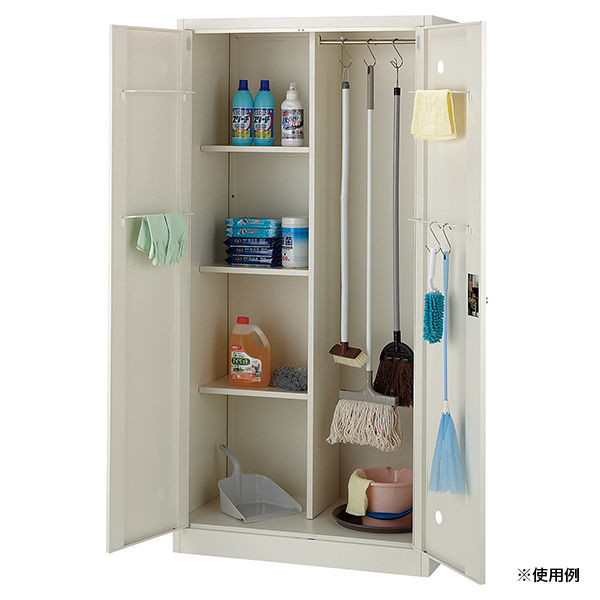 組立式のローコストタイプ掃除用具入れ。スチール製で頑丈なので、掃除道具一式を収納できます。学校、病院、オフィスなどで使える定番掃除用具入れです。