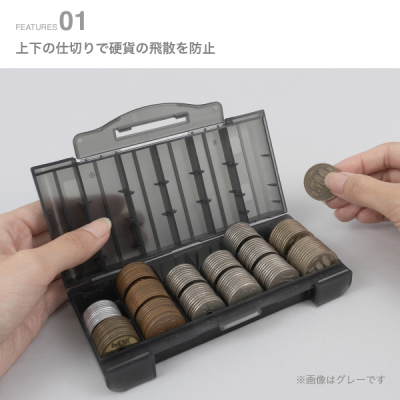フタとケースに仕切りがあり、ケース内の硬貨の飛散を防ぐことができるコインケースです。 6種類の硬貨を10枚ごとの仕切りで各50枚ずつ収納できます。 ●上下の仕切りで硬貨の飛散を防止 ●硬貨が数えやすい10枚区切りスペース ●仕切りは硬貨がつかみやすいカーブ形状 ●開閉しやすい大型止め具 ●持ち運びしやすいコンパクトサイズ