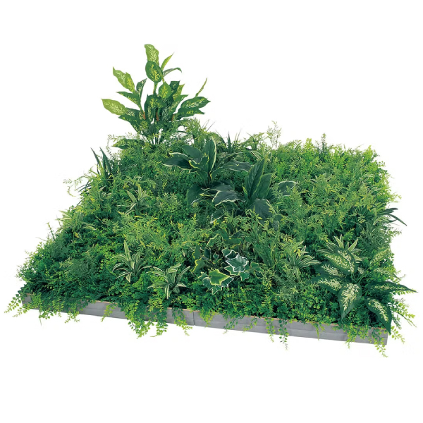 既存のプランター・造作家具や造作什器にセットして使う、設計・製作業者様向けのグリーンパーツです。グリーンを台座に取り付けてアレンジした状態でご提供するので、置くだけで簡単にセットできます。用途やイメージに合わせて、いろいろなグリーン演出ができるスクエアサイズのアレンジグリーンです。既存のプランターに合わせて、連接して使う演出スタイルで、広い面積をグリーン装飾することができます。600mm角のスクエアタイプでシックな色合いが落ち着いた雰囲気を演出。大きくボリューム感ある葉っぱでダイナミックに空間を演出します。