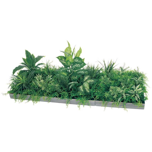 既存のプランター・造作家具や造作什器にセットして使う、設計・製作業者様向けのグリーンパーツです。グリーンを台座に取り付けてアレンジした状態でご提供するので、置くだけで簡単にセットできます。用途やイメージに合わせて、いろいろなグリーン演出ができるスクエアサイズのアレンジグリーンです。既存のプランターに合わせて、連接して使う演出スタイルで、広い面積をグリーン装飾することができます。450mm角のアレンジグリーンを3枚連接して使います。ライトなグリーンが明るい雰囲気を演出。ちょっとした間仕切りで癒しを演出します。