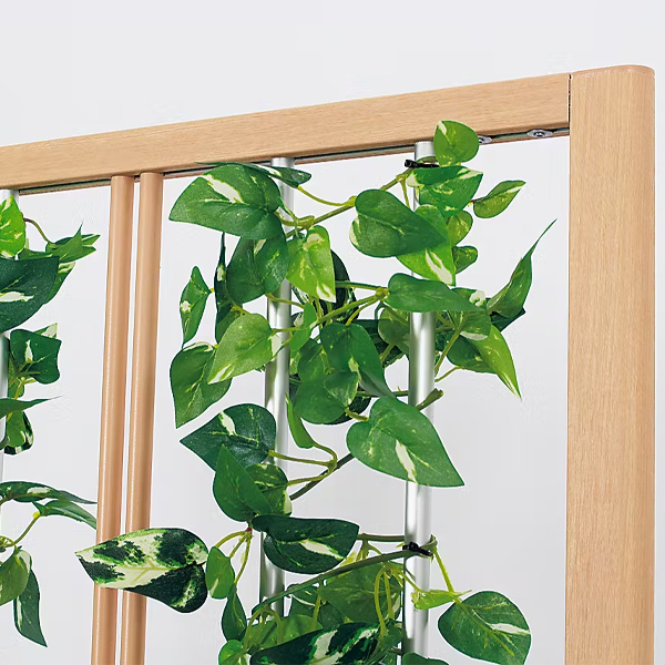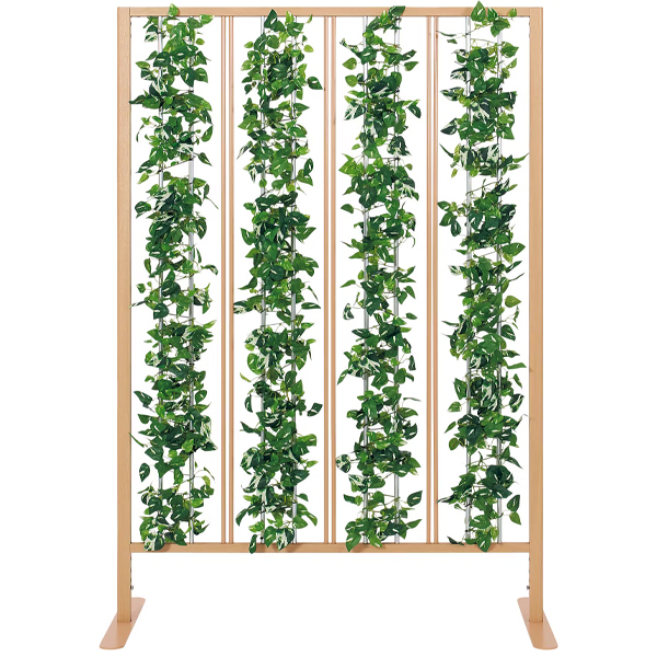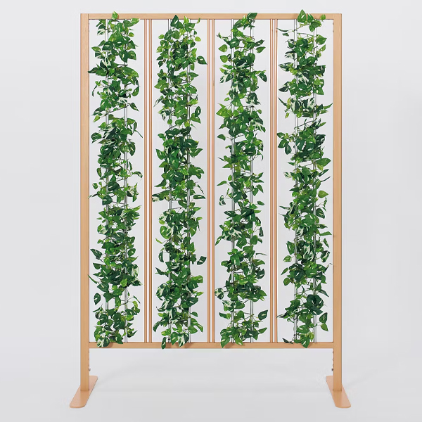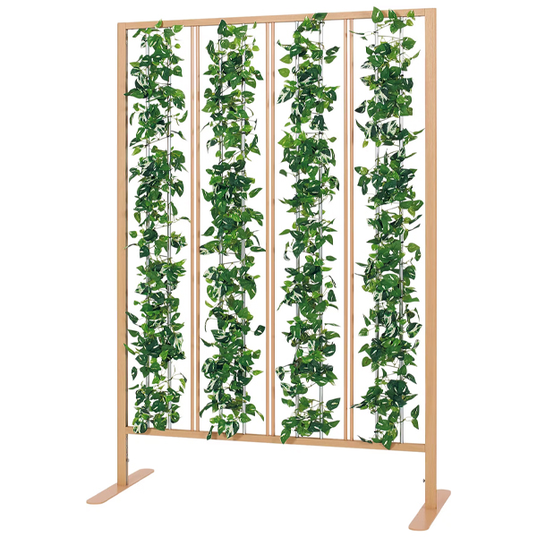 グリーンのカーテンで仕切るパネルパーテーション。高さ1300mmタイプ。ナチュラルのフレームは落ち着いた雰囲気を演出します。空間をインテリア感覚で、手軽におしゃれに間仕切りできるカジュアルなパネルパーテーションです。 オフィスやショールームで簡易にゾーニングできる、シンプルスタイルのグリーンカーテンタイプ。ナチュラルのフレームは落ち着いた雰囲気を演出します。グリーンアレンジやシルエットがスタイリッシュで、いろいろなシーンで使いやすいです。軽いので、設置や移動も楽に行えます。オフィスのミーティングスペースや、休憩エリアをさりげなく仕切ったり、ちょっと仕切りたいときに便利です。