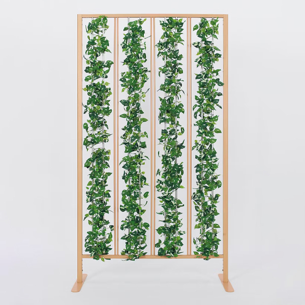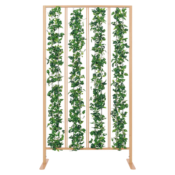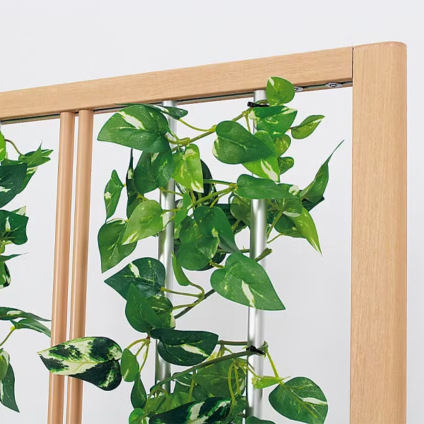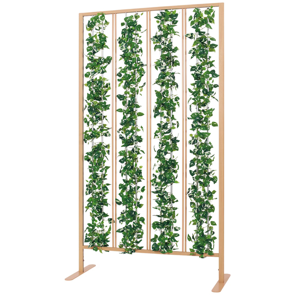 グリーンのカーテンで仕切るパネルパーテーション。高さ1600mmタイプ。適度な透け感がありつつ、高さがあるトールタイプです。空間をインテリア感覚で、手軽におしゃれに間仕切りできるカジュアルなパネルパーテーションです。 オフィスやショールームで簡易にゾーニングできる、シンプルスタイルのグリーンカーテンタイプ。ナチュラルのフレームは落ち着いた雰囲気を演出します。グリーンアレンジやシルエットがスタイリッシュで、いろいろなシーンで使いやすいです。軽いので、設置や移動も楽に行えます。オフィスのミーティングスペースや、休憩エリアをさりげなく仕切ったり、ちょっと仕切りたいときに便利です。