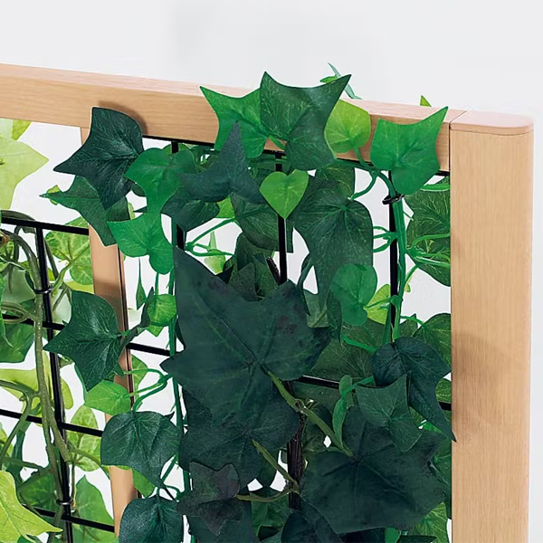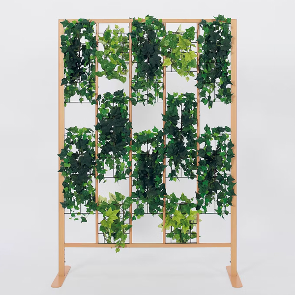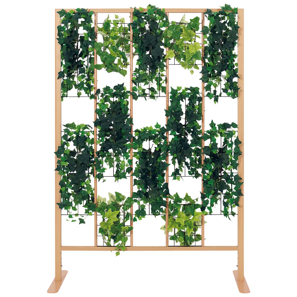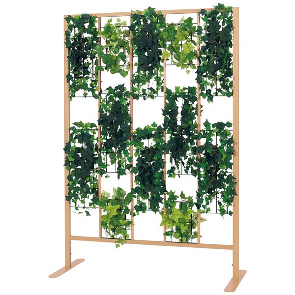 適度な透け感があるランダムタイプのパネルパーテーション。高さ1300mmタイプ。ナチュラルのフレームは落ち着いた雰囲気を演出します。空間をインテリア感覚で、手軽におしゃれに間仕切りできるカジュアルなパネルパーテーションです。 オフィスやショールームで簡易にゾーニングできる、シンプルスタイルのグリーンカーテンタイプ。ナチュラルのフレームは落ち着いた雰囲気を演出します。グリーンアレンジやシルエットがスタイリッシュで、いろいろなシーンで使いやすいです。軽いので、設置や移動も楽に行えます。オフィスのミーティングスペースや、休憩エリアをさりげなく仕切ったり、ちょっと仕切りたいときに便利です。