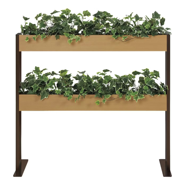 プランターが2段デザインのパーテーションW90mm。開放感があり、癒しやリラクゼーション効果を高めます。テーブルと通路などを仕切る薄型で、通路の装飾にも使えるスリム2段タイプです。 グリーンのボリュームもあり、連接することで、装飾を兼ね合わせて仕切ることができます。