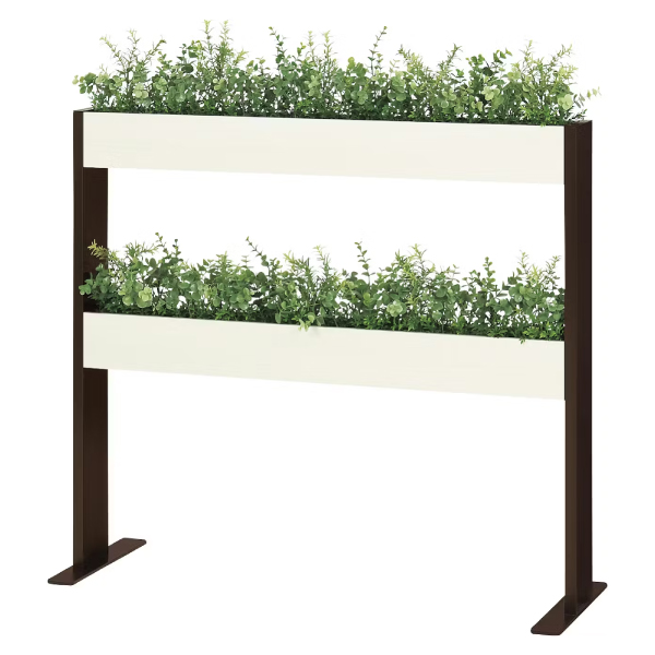 プランターが2段デザインのパーテーションW90mm。開放感があり、癒しやリラクゼーション効果を高めます。テーブルと通路などを仕切る薄型で、通路の装飾にも使えるスリム2段タイプです。 グリーンのボリュームもあり、連接することで、装飾を兼ね合わせて仕切ることができます。