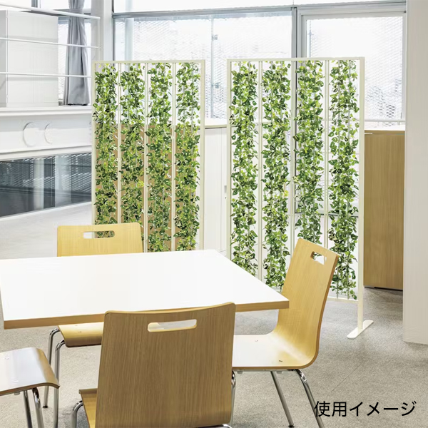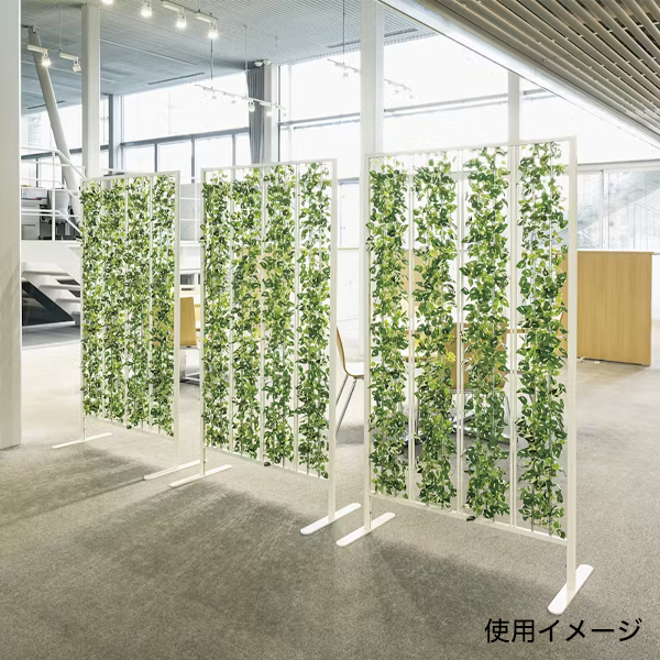 グリーンのカーテンで仕切るパネルパーテーション 高さ1600mmタイプ。エントランス等のオープンスペース向きのトールタイプ。空間をインテリア感覚で、手軽におしゃれに間仕切りできるカジュアルなパネルパーテーションです。 グリーンアレンジと隙間のバランスがおしゃれに配列された、インテリア感覚のランダムグリーンタイプ。 グリーンアレンジやシルエットがスタイリッシュで、いろいろなシーンで使いやすいです。