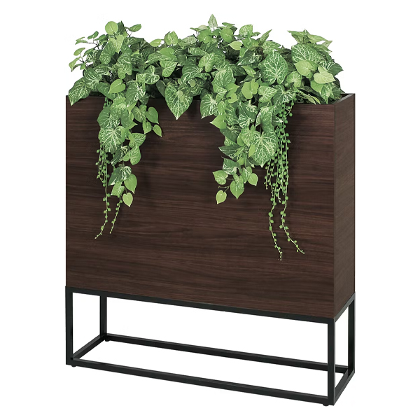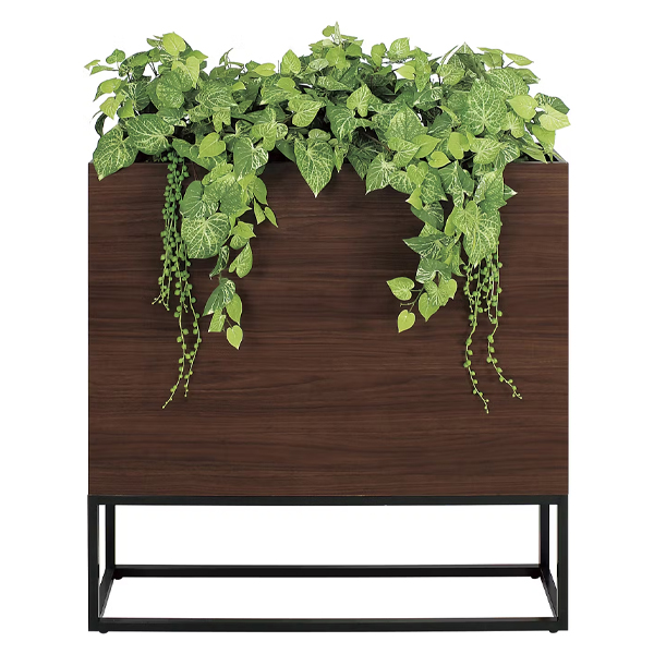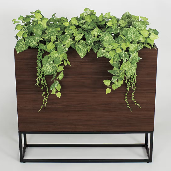 新感覚のBOXプランター、アイアン風の脚部が圧迫感なくオシャレです。 ワイド900mm幅で連接でも設置しやすいサイズ。 飲食店、フードコート、カフェ、オフィス、施設まで使いやすく、寄せ植え風の多彩なグリーンアレンジが見る人を飽きさせません。