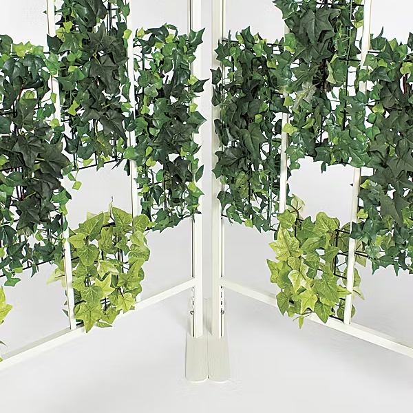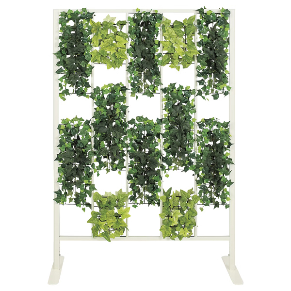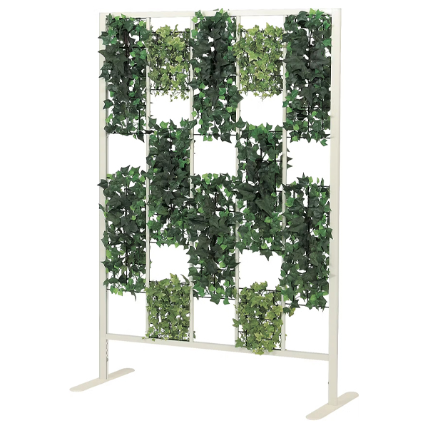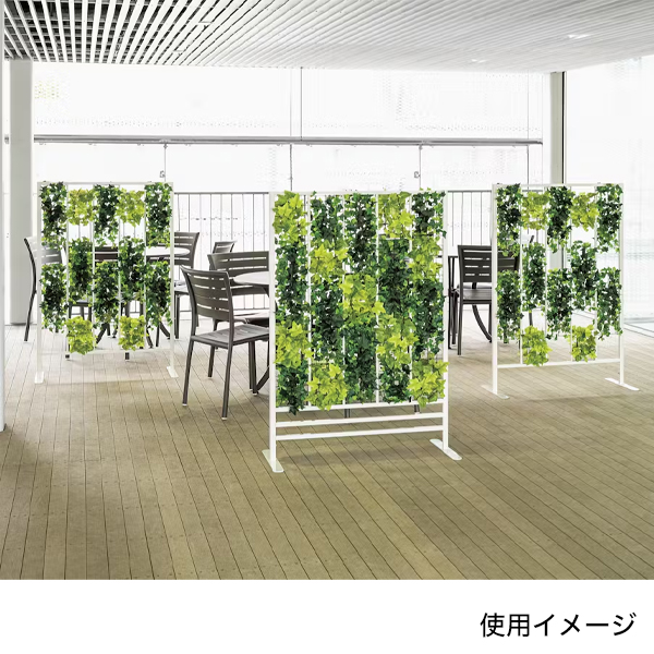 グリーンのカーテンで仕切るパネルパーテーション 高さ1300mmタイプ。アイビーの濃淡をランダムに配置した遊び心あるタイプ。空間をインテリア感覚で、手軽におしゃれに間仕切りできるカジュアルなパネルパーテーションです。 オフィスやショールームで簡易にゾーニングできる、シンプルスタイルのグリーンカーテンタイプ。 グリーンアレンジやシルエットがスタイリッシュで、いろいろなシーンで使いやすいです。