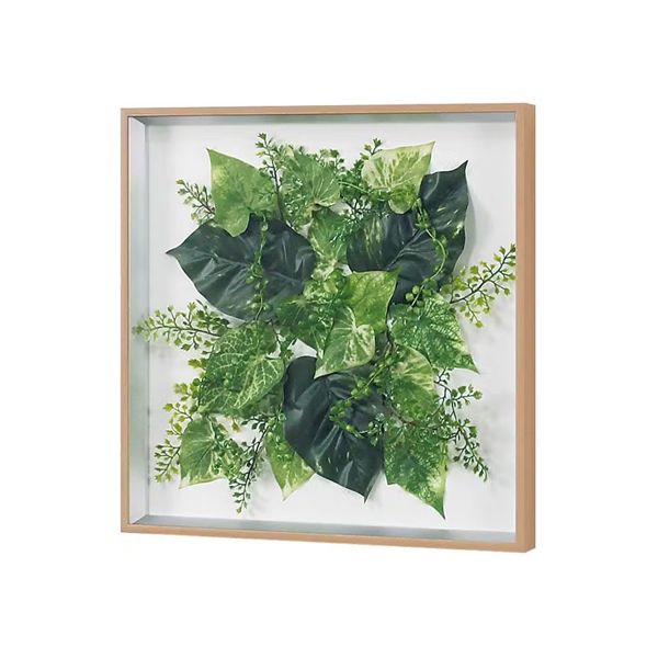透明カバー付き、45cm角の木目フレームのウォールグリーン。使い勝手の良いスクエアサイズは複数枚設置がオススメです。薄型でシャープなフレームにグリーンをアレンジしたアートパネル。 センスある癒しの空間が演出できます。葉っぱのおいしげった感じがグリーンを強調します。カジュアルグリーンは手軽に自然の雰囲気を楽しめます。薄型だから手軽にリラックス演出が可能です。お手入れ不要で衛生的、リラックス演出が必要な病院や老人ホームにおすすめです。