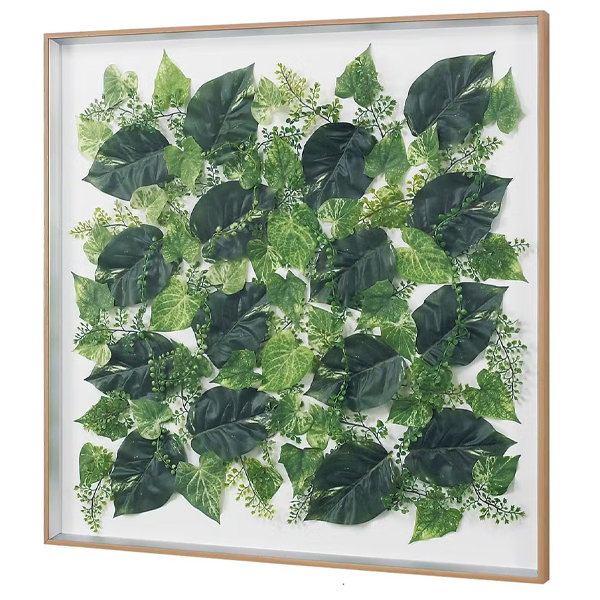 透明カバー付き、90cm角の木目フレームのウォールグリーン。エントランスやホール等の大きな壁面にオススメのサイズです。薄型でシャープなフレームにグリーンをアレンジしたアートパネル。 センスある癒しの空間が演出できます。葉っぱのおいしげった感じがグリーンを強調します。カジュアルグリーンは手軽に自然の雰囲気を楽しめます。薄型だから手軽にリラックス演出が可能です。お手入れ不要で衛生的、リラックス演出が必要な病院や老人ホームにおすすめです。