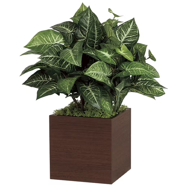キューブタイプの卓上ポット(大)。シンゴニウムの花言葉「喜び」が見る人をワクワクさせます。木目ポットがインテリアに合わせやすくオシャレです。 並べて使うと動きのあるディスプレイができます。