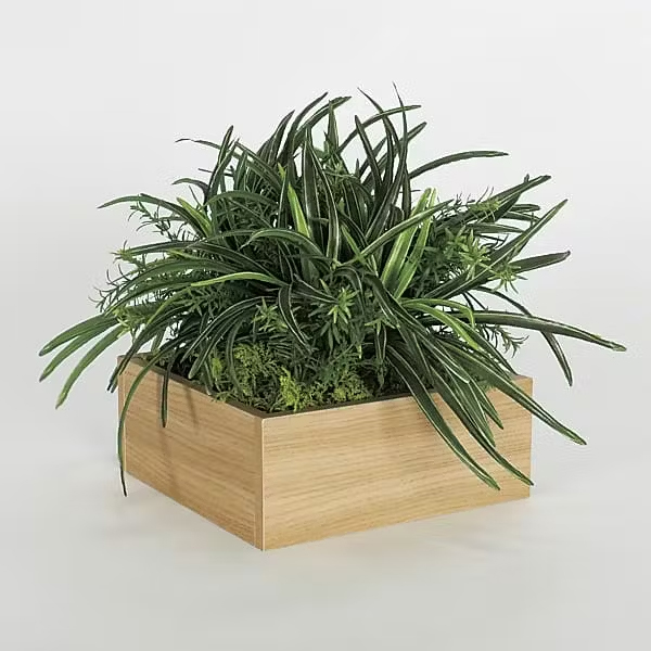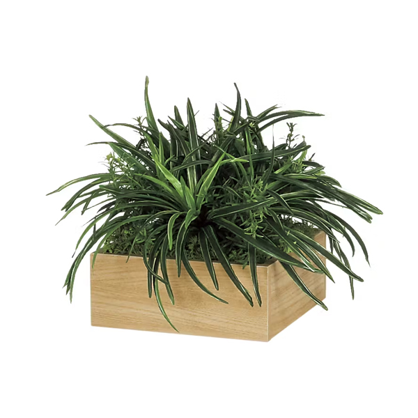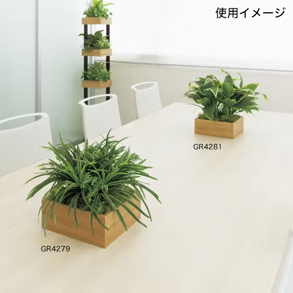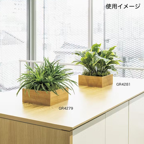 スクエアタイプの卓上ポット。シャープで清潔感のあるドラセナは、ミーティングスペースや飲食スペースにおすすめ。木目ポットがインテリアに合わせやすくオシャレです。 並べて使うと動きのあるディスプレイができます。