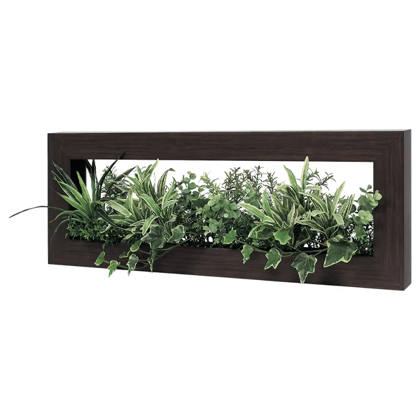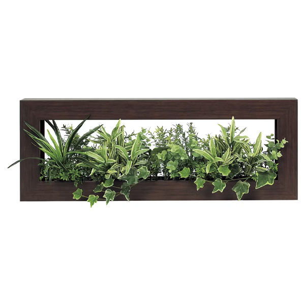 絵画の様に飾る壁掛けポット、空間を落ち着かせるワイドタイプ。グリーンを額縁に入ったアートパネル風にアレンジ。付属のフックで簡単に壁掛けできます。 ちょっとした空間にもワンポイントの演出をすることができます。 並べて使うと動きのあるディスプレイができます。 多彩でボリューム感あるグリーンアレンジが特長。