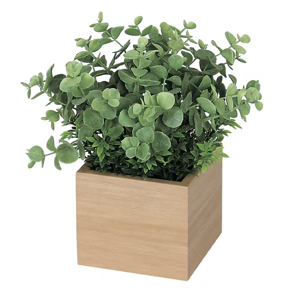 キューブタイプのミニ卓上ポット。ユーカリの花言葉は「思い出・再生」落ち着きたい場所にオススメ。小ぶりなミニポットはテーブルや什器、棚のちょっとしたスペースに飾れます。