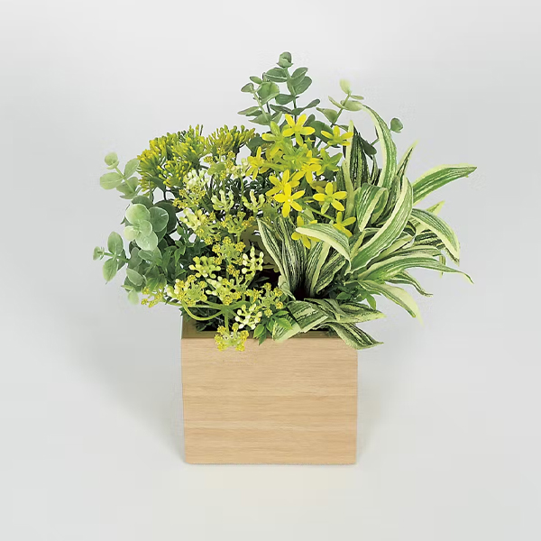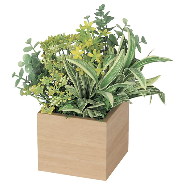キューブタイプのミニ卓上ポット。カジュアルな空間にマッチする、優しく可愛らしい「寄せ植え風アレンジ」小ぶりなミニポットはテーブルや什器、棚のちょっとしたスペースに飾れます。