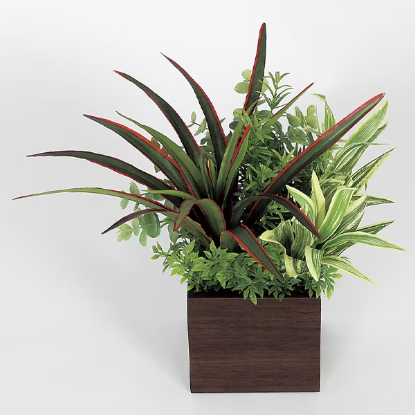 キューブタイプのミニ卓上ポット。洗練された空間にマッチする、シックで高級感ある「寄せ植え風アレンジ」。小ぶりなミニポットはテーブルや什器、棚のちょっとしたスペースに飾れます。