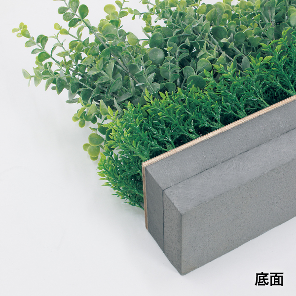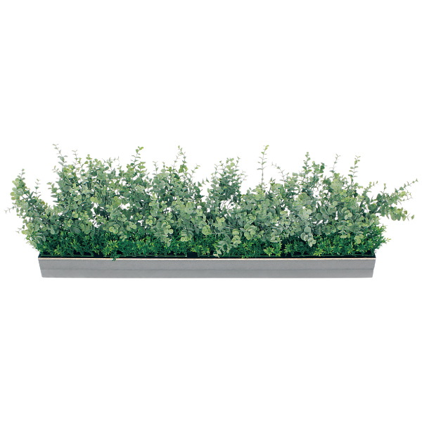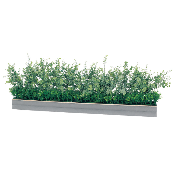 既存のプランター・造作家具や造作什器にセットして使う、設計・製作業者様向けのグリーンパーツです。グリーンを台座に取り付けてアレンジした状態でご提供するので、置くだけで簡単にセットできます。ポットやプランター用のワイドサイズのアレンジグリーンで、手軽に家具に組み込めるので、グリーン演出の幅が広がります。土台パネルがW900×D100mmのスタンドタイプ。ユーカリの花言葉は「思い出・再生」落ち着きたい場所にオススメです。