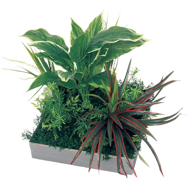 既存のプランター・造作家具や造作什器にセットして使う、設計・製作業者様向けのグリーンパーツです。グリーンを台座に取り付けてアレンジした状態でご提供するので、置くだけで簡単にセットできます。用途やイメージに合わせて、いろいろなグリーン演出ができるスクエアサイズのアレンジグリーンです。既存プランターに合わせて、連接して使う演出スタイルです。連接や組み合わせを工夫することで、オリジナリティーある演出が可能です。300mm角のスクエアタイプでシックな色合いで落ち着いた雰囲気を演出。大きくボリューム感ある葉っぱで迫力ある演出ができます。