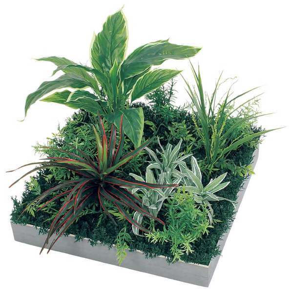 既存のプランター・造作家具や造作什器にセットして使う、設計・製作業者様向けのグリーンパーツです。グリーンを台座に取り付けてアレンジした状態でご提供するので、置くだけで簡単にセットできます。用途やイメージに合わせて、いろいろなグリーン演出ができるスクエアサイズのアレンジグリーンです。既存プランターに合わせて、連接して使う演出スタイルです。連接や組み合わせを工夫することで、オリジナリティーある演出が可能です。450mm角のスクエアタイプでシックな色合いが落ち着いた雰囲気を演出。連接して使う時に重宝するシンプルなアレンジです。