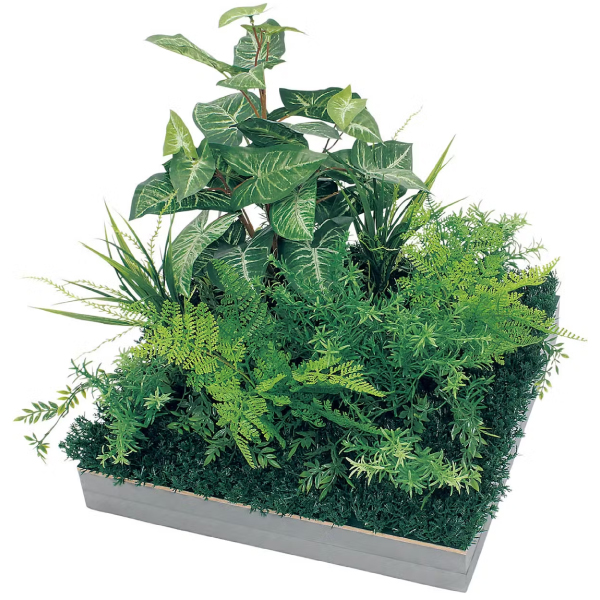 既存のプランター・造作家具や造作什器にセットして使う、設計・製作業者様向けのグリーンパーツです。グリーンを台座に取り付けてアレンジした状態でご提供するので、置くだけで簡単にセットできます。用途やイメージに合わせて、いろいろなグリーン演出ができるスクエアサイズのアレンジグリーンです。既存プランターに合わせて、連接して使う演出スタイルです。連接や組み合わせを工夫することで、オリジナリティーある演出が可能です。450mm角のスクエアタイプでシックな色合いが落ち着いた雰囲気を演出。連接して使う時に重宝するシンプルなアレンジです。