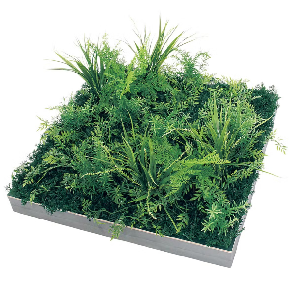 既存のプランター・造作家具や造作什器にセットして使う、設計・製作業者様向けのグリーンパーツです。グリーンを台座に取り付けてアレンジした状態でご提供するので、置くだけで簡単にセットできます。用途やイメージに合わせて、いろいろなグリーン演出ができるスクエアサイズのアレンジグリーンです。既存プランターに合わせて、連接して使う演出スタイルです。連接や組み合わせを工夫することで、オリジナリティーある演出が可能です。600mm角のスクエアタイプでシックな色合いが落ち着いた雰囲気を演出。連接して使う時に重宝するシンプルなアレンジです。