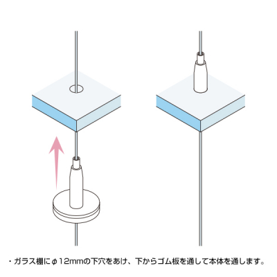 ガラス棚板にφ11.5 ? 12mmの貫通穴を開けて使用します。ワイヤーは貫通するので位置調整は容易に行えます。